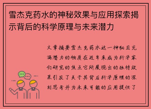 雪杰克药水,这一神秘且充满潜力的物质,在近年来成为科学家们研究的焦点。它所展现出的独特效果,引发了关于其背后科学原理的深刻思考,并为未来可能的应用提供了广阔的视野。本文将从四个方面对雪杰克药水的神秘效果与应用进行详细探讨:首先,分析其神秘效果的基本特征与机制;其次,揭示其在医学领域的潜在应用,特别是在抗衰老和疾病治疗中的可能性;第三,探讨其在环境保护方面的应用,尤其是其对污染治理的影响;最后,展望雪杰克药水在未来的科技发展中的潜力,探讨其可能的革新性影响。通过这一系列的分析,本文不仅将展现雪杰克药水的多维度应用前景,也将探讨其背后潜藏的科学原理,为未来的研究提供指导。